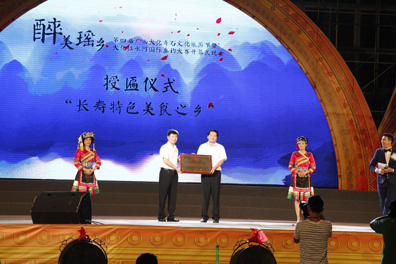 晚会期间,中国饭店协会授予大化瑶族自治县“中国长寿特色美食之乡”牌匾。大化县县长韦萧强接受牌匾。